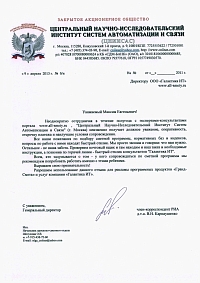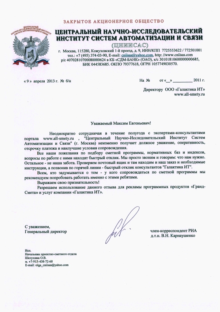 Неоднократно сотрудничая в течении полугода с экспертами-консультантами портала www.all-smety.ru, «Центральный Научно-Исследовательский Институт Систем Автоматизации и Связи» (город Москва) неизменно получает должное уважение, оперативность, отсрочку платежа и наилучшие условия сопровождения.