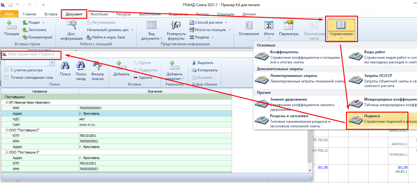 Открываем справочник подписи и заполняем его данными по поставщикам, обязательным реквизитом является ИНН, т.к. он требуется для формирования шифра ресурсов, порядок заполнения реквизитов не важен, все заполненные в справочник данные автоматически попадут в табличку конъюнктурного анализа.